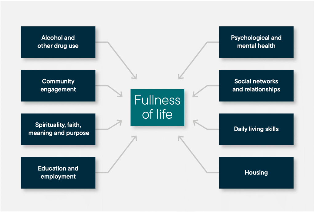 Outcomes are measured through a national AOD logic model, capturing indicators across individual capability, life circumstances, wellbeing and spirituality.